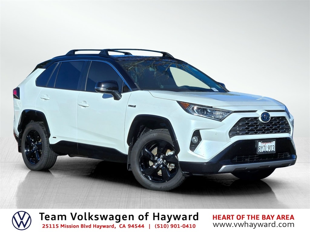 Blizzard Pearl/Midnight Black Metallic 2021 Toyota RAV4 Hybrid XSE 4D Sport Utility AWD 2.5L 4-Cylinder eCVT 2.5L 4-Cylinder, 3 Spoke Leather Steering Wheel, 4-Wheel Disc Brakes, Air Conditioning, Anti-Theft System, Apple CarPlay/Android Auto, Auto-dimming Rear-View mirror, Axle Ratio: TBD, Blind Spot Monitor, Driver door bin, Driver vanity mirror, Emergency communication system: Safety Connect with 1-year trial, Four wheel independent suspension, Front & Rear Parking Assist w/Automated Braking, Front Center Armrest, Front Door Smart Key System w/Push Button Start, Front dual zone A/C, Front Fog & Driving Lamp, Front reading lights, Front Seat Heating, Garage door transmitter: HomeLink, Heated front seats, Intelligent Clearance Sonar (ICS), Knee airbag, Navigation System, Occupant sensing airbag, Outside temperature display, Overhead console, Power driver seat, Qi-Compatible Wireless Smartphone Charging, Radio data system, Radio: Audio Plus, Rear anti-roll bar, Rear window defroster, Remote keyless entry, Roof rack: rails only, SofTex Seat Trim (EC), Speed-sensing steering, Split folding rear seat, Steering wheel mounted audio controls, Telescoping steering wheel, Trip computer, Turn signal indicator mirrors, Variably intermittent wipers, Wheels: 18" x 7.0J Black-Painted Aluminum Alloy, XSE Advanced Technology Package, XSE Package. Odometer is 2925 miles below market average!