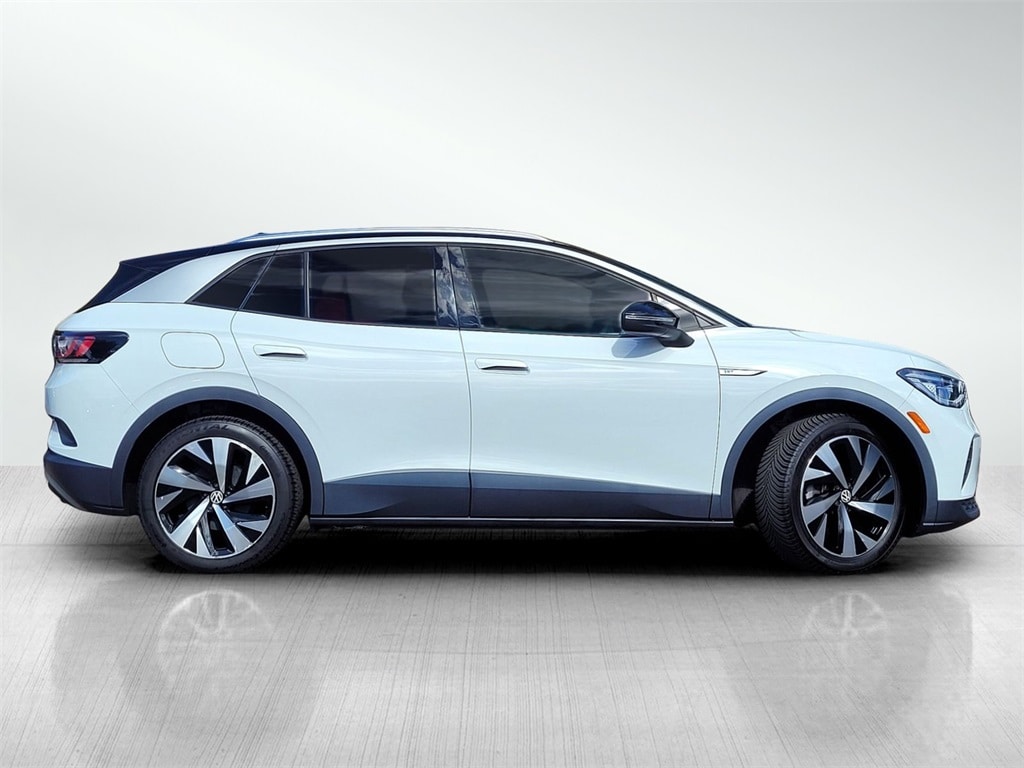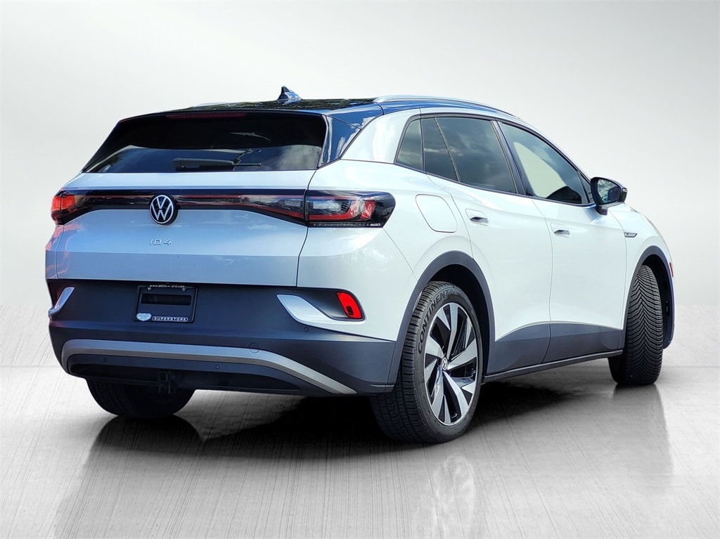 Glacier White Metallic/Black Roof 2021 Volkswagen ID.4 1st Edition 4D Sport Utility RWD Electric Motor Single-Speed Automatic 4.39 Axle Ratio, 7 Speakers, Air Conditioning, Auto-dimming Rear-View mirror, Automatic temperature control, Brake assist, Bumpers: body-color, Driver vanity mirror, Driver's Seat Mounted Armrest, Dual front impact airbags, Dual front side impact airbags, Electronic Stability Control, Exterior Parking Camera Rear, Four wheel independent suspension, Front anti-roll bar, Front Bucket Seats, Front dual zone A/C, Front fog lights, Fully automatic headlights, Heated front seats, Heated steering wheel, Heavy Duty Trunk Liner w/VW CarGo Blocks, Low tire pressure warning, Memory seat, Navigation System, Overhead airbag, Overhead console, Passenger seat mounted armrest, Passenger vanity mirror, Power door mirrors, Power driver seat, Power steering, Radio data system, Radio: Discover Pro Max w/12" Touchscreen Nav, Rear anti-roll bar, Rear seat center armrest, Rear window defroster, Remote keyless entry, Speed control, Split folding rear seat, Spoiler, Telescoping steering wheel, Traction control, Trip computer, Turn signal indicator mirrors, Variably intermittent wipers, Volkswagen Double Check (DISC), Wheels: 20" Dynamic Design Machined Alloy.